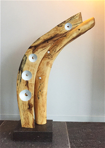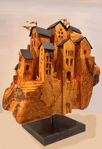 2022Een kasteel op een stuk eiland het bijzondere is dat door het spelen van het licht schaduwpartijen veranderen, de achterzijde is ook bewerkt met een poort en de stam vertoond daar veel kleine knoesten wat het de illusie geeft van rotsen aan de kust Is een van een serie beelden "zwevende eilanden in diverse materialen en verschijningsvormen