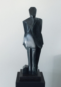 2020zwarte zakenman met tas aan zijn voet sterk geabstraheerd op zwarte hardstenen sokkel