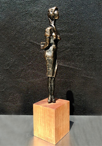 2018Prachtig slank meisje dat een boek op haar rug verstopt houdt. In kunststof, bronslook op een houten sokkel.