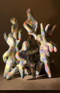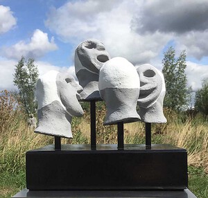 2021beelden van keramiek, en daarna nog een keer Raku gestookt op stenen sokkels