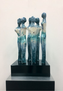 20216 ranke figuren als groep bij elkaar met mooie verloop glazuren in kleuren blauw en groen op zwart gelakt houten sokkel